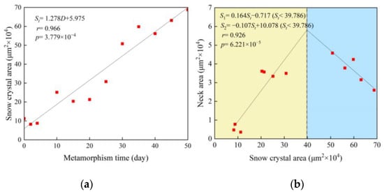 Snow crystals undergo changes from needle-like, broad slab, and columnar morphologies to deep frost during metamorphosis, and the size of the snow crystals themselves constantly changes []. In order to explore the effect of snow crystal neck area on snow crystal size, Figure 10a statistically shows the change in the average size area of snow crystals (St) with metamorphosis time (D). It can be seen that, excluding the days at the beginning of metamorphosis and the days when the temperature increased from the 18th day, the snow crystal area showed an increasing trend. The surface area of snow crystals was initially larger because new snow retained the intact dendritic structure. With the onset of metamorphism, the dendritic structure was compressed and gradually disappeared, and the snow crystal area contracted. During the days of rapid temperature rise, as analyzed in Section 3.2.2, the vapor diffusion of the snow crystals increased and the area contracted. However, for the entire metamorphic period, the individual fine-grained snow crystals gradually coalesced to display an increasing trend in overall snow crystal area.