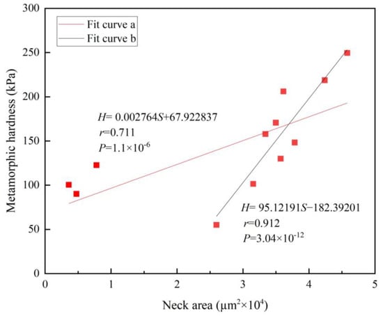 The snow crystal neck area and snow hardness have a good correlation, as shown in Figure 11. This finding demonstrates how many of the physical and mechanical characteristics of snow, including hardness and shear strength, are significantly influenced by the area around the snow crystal neck. The explanation for this is that ice particles may transfer loads to snow necks without experiencing significant deformation because they have a higher mass and are more rigid structurally than snow necks. The stresses within the snow crystals are exposed to the loading peak at the neck, similar to any cohesive granular material; in other words, the neck region bears the most stress during penetration tests. On the other hand, snow necks are more likely than ice grains to deform when they are put under additional strain and start to give and flow. However, snow triaxial measurements reveal that the stresses at the snow neck are 5 to 50 times greater than those at the grains [], which is sufficient to demonstrate the influence of the neck area on the physical characteristics of the entire snow body.
