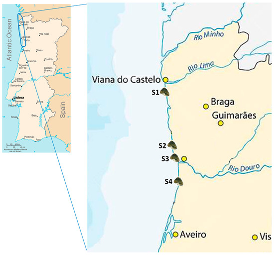 Map showing the sampling locations of the study area on the northwest Portuguese coast. S1—Amorosa (41°39′34.3″ N 8°49′29.8″ W); S2—Cabo do Mundo (41°13′15.8″ N 8°42′58.0″ W); S3—Homem do Leme (41°09′31.8″ N 8°41′10.0″ W); S4—S. Félix da Marinha (41°02′8.91″ N 8°38′55.1″ W).