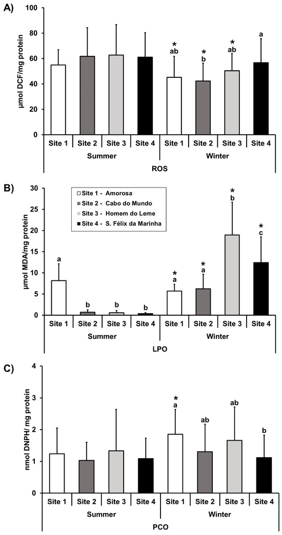 Spatiotemporal variation of (A) reactive oxygen species (ROS), (B) lipid peroxidation (LPO), and (C) protein carbonyl content (PCO) levels in Phorcus lineatus sampled during summer and winter from four sites on the northwest Portuguese coast (S1: Amorosa; S2: Cabo do Mundo; S3: Homem do Leme; S4: S. Félix da Marinha). Data are expressed as mean ± S.D. Statistical analysis was performed using two-way ANOVA followed by Tukey’s multiple comparison test. Different lowercase letters indicate significant differences between sites during the same season (p < 0.05), and asterisks (*) indicate significant differences between seasons for each site (p < 0.05). Absence of superscript indicates no significant differences.