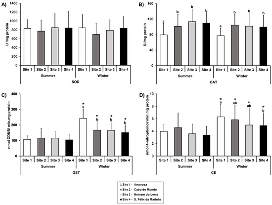 Spatiotemporal variation of (A) superoxide dismutase (SOD), (B) catalase (CAT), and (C) glutathione-S-transferase (GST), and (D) carboxylesterase (CE) activity in Phorcus lineatus sampled during summer and winter from four sites on the northwest Portuguese coast (S1: Amorosa; S2: Cabo do Mundo; S3: Homem do Leme; S4: S. Félix da Marinha). Data are expressed as mean ± S.D. Statistical analysis was performed using two-way ANOVA followed by Tukey’s multiple comparison test. Different lowercase letters indicate significant differences between sites during the same season (p < 0.05), and asterisks (*) indicate significant differences between seasons for each site (p < 0.05). Absence of superscript indicates no significant differences.