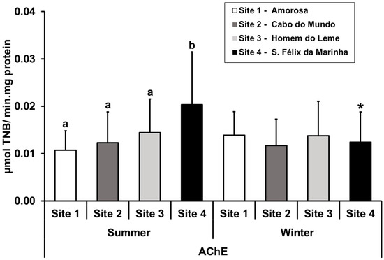 CE catalyzes the hydrolysis of a wide range of exogenous and endogenous carboxylesterases and plays a protective role against organophosphate insecticides [44], and therefore qualifies as a suitable enzyme for pollution monitoring. AChE, which catalyzes the hydrolysis of the neurotransmitter acetylcholine in the cholinergic neurons, is also a common biomarker of neurotoxicity [45]. Both cholinesterases and carboxylesterases belong to the group of hydrolases [44]. In the present study, CE (Figure 3D) showed similar activity in all the sites during the warm season (p > 0.05), but its activity increased significantly during the winter season (p < 0.01). During the cold season, the gastropods of Site 1 presented higher CE activity than Site 4 (p = 0.040). Contrarily, AChE (Figure 4) showed significant variation in the summer season, with the gastropods of Site 4 having a higher AChE activity than those of Sites 1 and 2 (p < 0.001) and Site 3 (p = 0.007). However, in the winter period, the gastropods exhibited similar levels of AChE activity in all sites (p > 0.05). It has been suggested that the combination of CE and AChE in biomonitoring programs may provide useful information about the potential exposure and effects of pesticides on aquatic invertebrates [44]. In the present study, a distinct seasonal profile between CE and AChE was observed, with CE presenting higher activity in the cold season and AChE with higher activity in the warm period. In field studies, seasonal variations in CE and AChE activity were demonstrated, mostly related to the contamination inputs in the sampling areas [35,45,46,47,48]. Nonetheless, it has been suggested that is also necessary to consider the effects of environmental variables, particularly temperature, on the seasonal variation of CE and AChE activity [44,47,49]. For instance, higher AChE activity at higher temperatures (summer) have been demonstrated in the gills of Mytilus sp. [47]. Besides, the seasonal variation observed in this study could also be related to the reproductive cycle of P. lineatus. Najimi et al. [50] found that the periods of maximal and minimal activity of AChE coincided, respectively, with the spawning and sexual rest of the mussel Perna perna.
