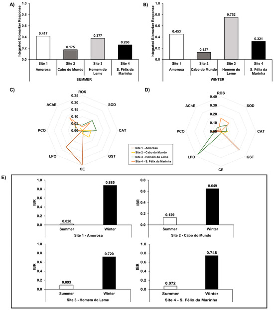 Integrated biomarker response (IBR) values and corresponding star plots for (A,C) summer and (B,D) winter in the four sampling sites on the northwest Portuguese coast. (E) IBR values for each site.