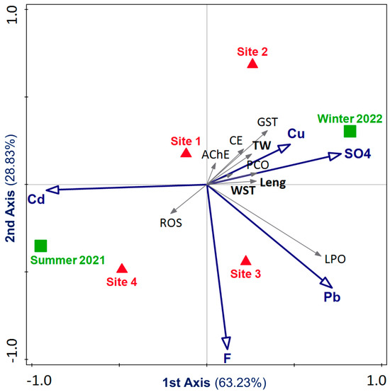 The redundancy analysis (RDA) results showed which studied variables related to enzymatic activities and biometric variables contributed more to the explained variance in response to physicochemical parameters (PC) and specific pollutants (SP) (Figure 6). Monte Carlo permutations were highly significant for all axes (p < 0.001; 95.06% for the first two axes), where physicochemical parameters and specific pollutants account for 14.88% of the total variance (Figure 6). The variables most positively correlated with axis 1 were the biometric variables (the weight of the soft tissues (WST), length (Leng), and total weight (TW)), and the most negatively correlated variable was ROS, which was also positively correlated with the increased concentration of SO4 and Cu, but negatively correlated with Cd. AChE, CE, and GST were positively correlated with axis 2, and increased with higher concentrations of Cu and SO4, conversely to ROS. LPO was negatively correlated with axis 2, along with the increased concentration of F− and Pb.