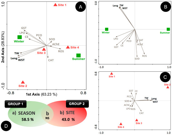 Partial redundancy analysis (pRDA) for (A) sites and season of the studied variables; (B) group 1—season; and (C) group 2—sites. (D) Partition of the variation in enzymatic activities and biometric variables explained by the two groups, testing the simple effects. Abbreviations: Site 1: Amorosa; Site 2: Cabo do Mundo; Site 3: Homem do Leme; Site 4: S. Félix da Marinha; AChE: acetylcholinesterase, CAT: catalase, CE: carboxylesterase, GST: glutathione S-transferase, Leng: length, LPO: lipid peroxidation; PCO: protein carbonyl content; ROS: reactive oxygen species; SOD: superoxide dismutase; TW: total weight; WST: weight of the soft tissues.