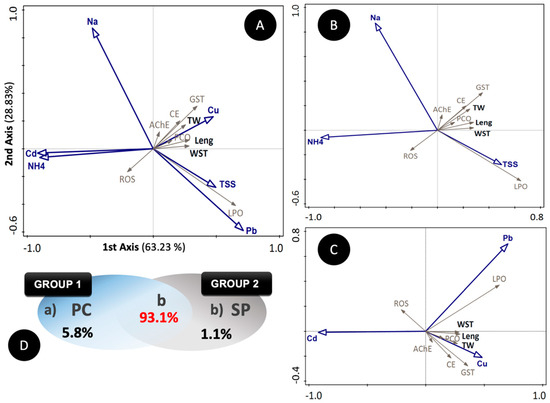 A pRDA of two groups of variables, testing simple effects, was processed (group 1, the PC, with three variables—TSS, NH4, and Na; and group 2, the SP, with three variables—Cd, Pb, and Cu) (Figure 8A–C). The results reflected a lower contribution to the explained variation from PC (5.8%) and SP (1.1%) compared to the shared variation between the two groups (93.1%) (Figure 8D). The PC pRDA biplot (Figure 8B) highlights that axis 1 splits ROS (positively associated with NH4) from the other enzymatic activities, except for LPO, which is positively associated with TSS and negatively with Na. A similar pattern was observable in the SP pRDA indicating that, once again, ROS shows a behavior contrary to the other enzymatic activities (positively related to Cu concentration). Also, in this analysis, LPO stands out, presenting activities associated with high Pb concentrations. The biometric parameters, in particular WST and length, are negatively correlated with high concentrations of Cd.