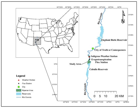 Saltcedar (Tamarix spp.) is an exotic deciduous shrub that grows best in riparian areas with shallow groundwater [1]. It is found mostly in floodplains and various alluvial soils influenced by adjacent rivers [2]. Saltcedar possesses many characteristics that allow it to outcompete native plants in riparian areas of arid environments in the Southwestern U.S. A saltcedar shrub can produce up to half a million small and light seeds per growing season. The seeds can disperse easily by wind and water, allowing them to spread along sandbars and riverbanks [3,4]. Saltcedar also spreads and reestablishes vegetatively in riparian areas and adjacent upland sites following flooding events [5]. Established saltcedars have deep root systems that allow them to access deeper groundwater in riparian areas than most native shallow-rooted plants. They can consume large amounts of water (i.e., evapotranspiration) ranging from 1000 mm to 1500 mm per year [6,7,8,9,10]. Saltcedar are facultative halophytes that can use saline groundwater by excreting excess salts through the leaf glands [5]. These saltcedar characteristics allow them to dominate native plants in riparian areas, creating a less diverse ecosystem.