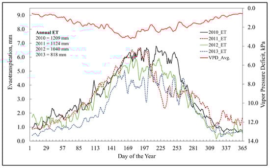 Evapotranspiration was determined as a residual in the energy budget. Five-day moving average ET values and vapor pressure deficit (VPD) for the four years are shown in Figure 2. The annual ET was determined as 1209 mm (N = 365 days) in 2010, 1124 mm (N = 365 days) in 2011, 1040 mm (N = 366 days) in 2012, and 818 mm (N = 365 days) in 2013. The daily vapor pressure deficit (VPD) during the management period ranged from 0.09 kPa in the Fall to 4.24 kPa in the peak of the growing season (Figure 2). The VPD value is a good indicator of the demand for moisture in the air; the higher the VPD, the higher the demand for moisture. It is the difference between saturated and actual vapor pressure, calculated using air temperature and relative humidity following Allen et al. [51]. Mowing of saltcedar did not occur until mid-summer 2011 (Figure 3A,B). Saltcedar was mowed only once in 2011 (DOY 209) and was left to grow the following year to observe its effects after mowing once. In 2013, the site was mowed in January, June, and September (Figure 3C–F), allowing underbrush to thrive.
