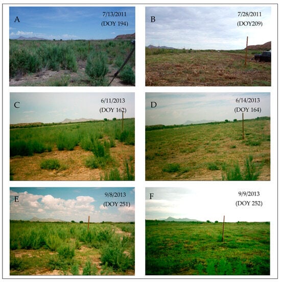 Photo illustrating before and after the management of saltcedar by mowing during 2011 (A,B) and 2013 (C–F) at Caballo Managed Saltcedar site, Las Palomas, New Mexico. Mowing saltcedar allowed grasses and small brushes to flourish and grow more vigorously. Before and after photos for the first cut in 2013 are not available.
