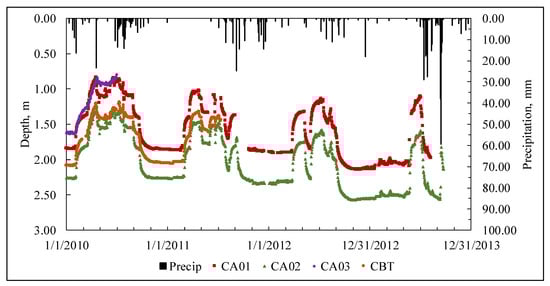 Depths to groundwater table (DWT) from the ground surface of thirty-minute samples were collected from 2010 to 2013 using four pressure transducers with dataloggers from the monitoring wells (i.e., CA01, CA02, CA03, and CBT). Depths to groundwater table data were converted from 30-min means to daily means. Daily DWT, including precipitation from 2010 to 2013, is shown in Figure 4. Sensors for wells CA03 and CBT malfunctioned during the study due to clogging of the wells by fine soils. Long-term data was not collected. The DWT levels varied from 0.75 to 2.6 m. Fluctuation in DWT correlate with water released from the Elephant Butte Reservoir during the irrigation season and from several rainfall events. Due to prolonged drought in the region and less water being released from Elephant Butte Reservoir, an increase in DWT was observed over the years. On average, DWT from all piezometer wells was about 1.46 m in 2010, 1.60 m in 2011, 1.83 m in 2012, and 2.06 m in 2013 during the growing season. The DWT at the site is often deeper (~2.6 m) during the non-growing season when less water is released from Elephant Butte.