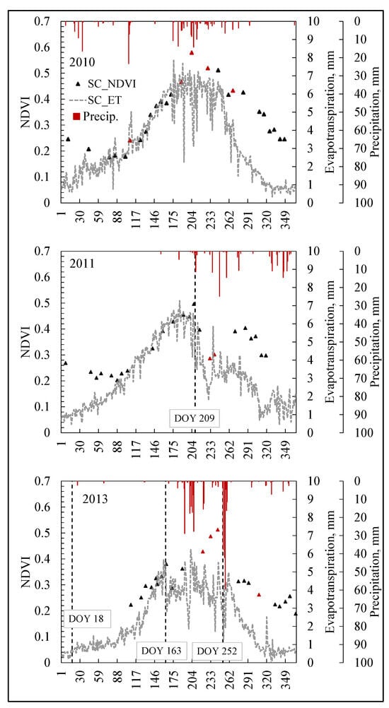 Normalized Difference Vegetation Index (NDVI), Evapotranspiration (SC_ET), and Precipitation (Precip.) for Caballo Mowed Saltcedar Study Site, Las Palomas, New Mexico. Mowing was conducted during 2011 and 2013 on a given day of the year (DOY; vertical dash lines). Red Triangular Colored NDVI represents the effects of moist soil due to rainfall on previous days—no satellite data in 2012.