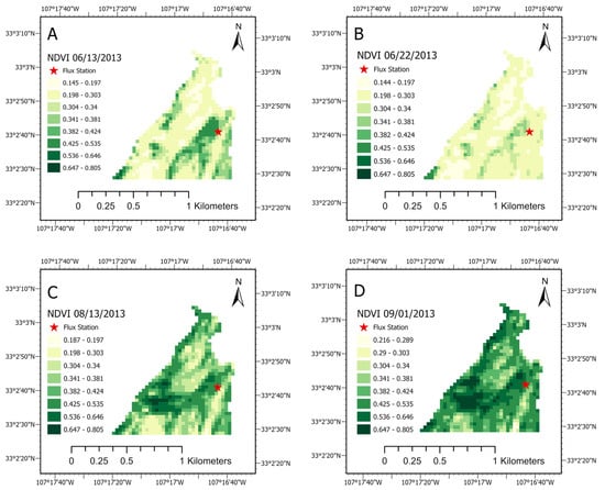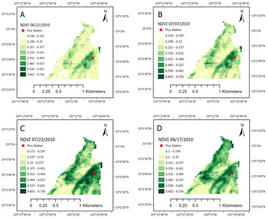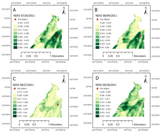 The growing season per annum at the managed saltcedar site averaged 241 days for four years (2010–2013). The leaves started budding at about DOY 71 and reached senescence by DOY 311. During 2010, NDVI reached 0.58 during the peak of the season. Some spikes in NDVI during that year are attributed to the moist soil from precipitation that occurred days prior (represented in red triangles in Figure 5). Darker pixilation shades of NDVI due to moist soil from precipitation during 2010–2013 are shown in Figure 6B,C, Figure 7B and Figure 8C,D. When mowing was conducted in 2011 and 2013, NDVI decreased following similar trends as ET (See Figure 5). These changes were also observed in Figure 7A–C and Figure 8A,B. When saltcedar grew again, NDVI began to increase until plants reached senescence. During the second cut of saltcedar in June 2013, NDVI dropped significantly. The second cut allowed the undergrowth of small vegetation and grasses to become dense and flourish. Although a significant drop in NDVI was shown due to the effect of mowing, values increased quickly after monsoonal rains. Plants accessed plenty of moisture in the soil, allowing them to become lusher with an increase in green foliage. However, after the soil moisture decreased, NDVI values declined until the plants were senesced. In combination with ET monitoring, readily available NDVI satellite images can be used to monitor and manage riparian vegetation’s health.