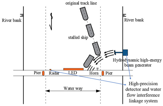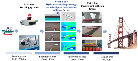Current anti-collision devices lack true active collision prevention. In cases where collisions cannot be avoided, passive protective devices are still needed to ensure bridge safety, protect both the ship and the bridge, and prevent other issues. Therefore, an active anti-collision method for bridges based on hydrodynamic energetic beams was proposed in this work, using hydrodynamic energetic beams to form an intervention belt with pressure greater than on the backflow surface. The energetic beams were gradually curved along the direction of the flow and eventually aligned with the direction of the cross-flow [21]. Subsequently, an intervention belt was used to direct the bow of the yawing ship to realize active collision avoidance. An existing warning system and passive anti-ship collision device formed the Trinity Bridge anti-ship collision system. Consisting of the bridge abutment in the bridge section, the river flow conditions, and the channel level, the bridge channel was divided into a warning area, emergency area, intervention area, and bridge area. Three lines of defense were built to ensure the safety of navigation in the bridge area waters, as shown in Figure 2. A hydraulic high-energy beam device was installed in the intervention area, and high-accuracy detectors and a water flow interference linkage system were deployed on the bridge. When a yawing ship entered the emergency area and was still yawing after an invalid warning, the hydraulic high-energy beam device was deployed. The operation principle of the hydraulic high-energy beam device is shown in Figure 3. By monitoring the ship’s movement trajectory in the waters around the bridge area, a hydraulic high-energy beam device in the intervention zone was set on the side of the bow of the vessel to change the ship’s direction and ensure active collision avoidance. This reduced the risk of the ship hitting the collision avoidance devices and causing damage to the ship, enhancing the safety of the navigable sections of the river and the bridge [19].