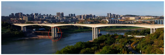 A bridge in the Jialing River basin served as the engineering background. Building upon the original passive anti-ship collision device, a new approach was developed in this study to provide a ship deflection collision avoidance method based on hydrodynamic high-energy beam intervention in the flow field for ship collision prevention. The bridge had a span of 1458 m, with the greatest risk of ship collision occurring at the No. 6 main perennial pier (Mao 2021), as shown in Figure 4. Therefore, the primary focus of this work was the No. 6 main pier for anti-ship collision research.