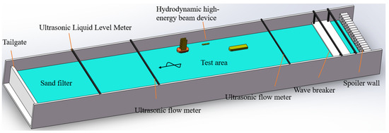 An ultrasonic level meter was used to monitor the test water depth; an ultrasonic tachometer monitored the water flow rate; and a high-definition camera was set up in the test area directly above the bridge pier to record video of the ship’s motion response. In the water inlet portion of the rectification wall and pressure wave plate, the control test water depth was set to greater than 0.3 m to eliminate the effect of shallow water on the test [27]. The test setup had several considerations, namely, the test abutments and the overall arrangement of the passive collision avoidance devices in the test area, which were positioned 2.8 m from the left side of the entrance. In addition, the vertical distance from the side wall was 0.5 m to eliminate the shore wall effect on the ship’s impact [28,29]. The central deployment of the high-energy beam device was set at a vertical distance of 0.3 m from the side wall. The test region was set at a horizontal distance from the left side of the entrance to prevent damage to the bridge abutment in the high-energy beam intervention zone in the mainstream flow direction. The net distance between the piers was less than 1.5 D for the dangerous navigation distance (D: width of the piers) [29], as the ship was more dangerous downstream [30]. This study positioned the ship along the channel boundary from the side wall 0.5 D (77 m) downstream of the most dangerous conditions as the ship’s initial conditions. When the ship was 0.5 m from the nozzle, the device was turned on. A schematic showing the model test setup is shown in Figure 6.