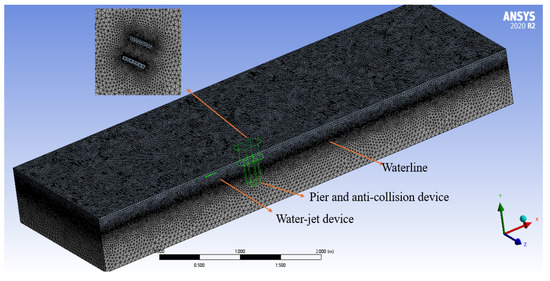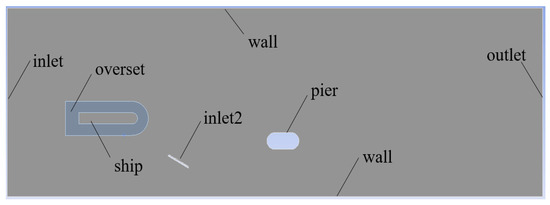 The computational setup involved specific boundary conditions. For the inlet conditions, we specified the left boundary of the computational domain as the velocity inlet (inlet), given that the water flow conditions for the X-axis were positive. For the exit conditions, we specified the right boundary of the computational domain as the free outlet (outlet). For the piers and collision avoidance devices, solid wall boundary conditions (pier) were implemented, while the boundaries on the two sides of the computational domain were set to solid wall boundary conditions (wall), and the node velocity was 0. For the hydrodynamic high-energy beam nozzle conditions, a computational domain of the hydrodynamic high-energy beam nozzle was specified at the velocity of inlet 2 (inlet2), given the water flow conditions for the Y-axis forward. In terms of the dynamic grid conditions, the ship boundary was defined as (ship), and the boundary of the double ship width area around the ship was set as the designated dynamic grid boundary (overset).