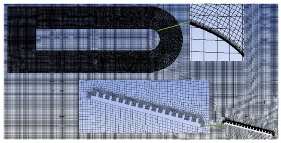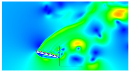 When the total number of model grids is 4.69 million, the error of peak device stress is 10.37% compared to 5.59 million, and the total number of model grids is 5.59 million, the error of peak device stress is 1.0% compared to 6.46 million. Therefore, in this paper, we choose the full domain grid number of 5.59 million for the time independence validation, and establish five monitoring points at X/D = 15, Y/D = 2, 4, 6, 8, 10, and compare the VX and VY of the five monitoring points at the moment of 30 s under the calculation of different time steps, and validate the temporal independence of the step size of 0.0125 s, 0.01 s, 0.0075 s, and 0.005 s as in Table 4. The relative error of VX is 7.01%, and the relative error of VY is 6.98% for the time steps 0.0125 s and 0.01 s, and the relative error of VX is 1.56%, and the relative error of VY is 1.11% for the time steps 0.01 s and 0.0075 s, so in this paper, we chose 0.01 s as the time step for the numerical simulation. The typical working condition of the test area for local refinement of the test area is shown in Figure 8, and the overall meshing of the computational domain is shown in Figure 9.