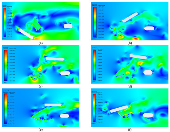 When the device deployment angle was less than −45°, it hindered the formation of the intervention belt due to insufficient nozzle mixing intensity. When the intervention belt deployment angle was more than 45°, the width of the flow surface exceeded the width of the bridge abutment flow surface. Finally, the number of nozzles was selected as 16, and the installation angles of the device were set to −30°, −15°, 0°, 15°, 30°, and 45° for the six conditions to screen the installation angle. The velocity maps for each condition are shown in Figure 10.