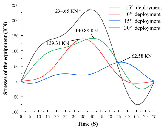The ship motion response state was better at −15°, 0°, 15°, and 30°. The device condition from open to close was monitored for a total of 75 s to achieve device stress monitoring, resulting in a device stress change over time curve, as shown in Figure 11.