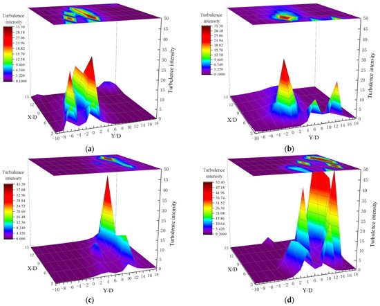 According to the above comparison diagrams, the turbulence intensity in the X and Y directions changed drastically and showed no obvious distribution pattern. In addition, the peak value of turbulence intensity in the Y direction was more dispersed in R = 3, 3.5, and 5, which indicated that the mixing of the high-energy beam with the main stream was drastic and had a larger range for these three jet ratios. Notably, the X-direction turbulence intensity was more concentrated, and the peak value was smaller. In addition, the Y-direction turbulence intensity peak value was small, and the degree of change was relatively smooth for the optimal R = 4 condition, which was used for subsequent investigation. At this point, the X-direction turbulence intensity was more concentrated, and the integrated maximum peak value was small. The maximum peak value occurred at X/D = 3 and Y/D = 12, and the peak size was 36.44. The degree of change in the Y-direction turbulence intensity was relatively smooth, with the maximum peak appearing at X/D = 3 and Y/D = 8, and the peak size was 6.21.