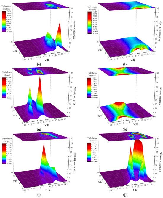 Turbulence intensity clouds (a) R = 3, X-direction turbulence intensity; (b) R = 3, Y-direction turbulence intensity; (c) R = 3.5, X-direction turbulence intensity; (d) R = 3.5, Y-direction turbulence intensity t; (e) R = 4, X-direction turbulence intensity; (f) R = 4, Y-direction turbulence intensity. (g) R = 4.5, X-direction turbulence intensity; (h) R = 4.5, Y-direction turbulence intensity; (i) R = 5, X-direction turbulence intensity; (j) R = 5, Y-direction turbulence intensity.