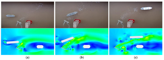 Due to the pressure difference between the front and rear boundaries of the intervention zone, the main body of the intervention zone gradually changed its direction under the action of the main stream into a downstream penetration section parallel to the main stream. Three key moments occurred where a change in the ship’s motion response was observed through the action of the intervention zone. In Moment 1, the ship approached the intervention zone, as shown in Figure 14a. In Moment 2, the intervention zone acted to deflect the bow of the ship, leading to a change in its heading, as shown in Figure 14b. In Moment 3, the ship managed to establish a sufficient safety distance from the bridge abutment after the action of the intervention zone, and its heading returned to its original direction, as shown in Figure 14c.