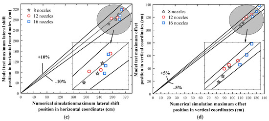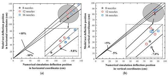 (3) Numerical simulations and a generalized model test of the ship motion response deflection position showed a maximum error of −9.8% in the horizontal coordinate and −7.0% in the vertical coordinate. The maximum deflection position had a maximum error of −6.8% in the horizontal coordinate and −3.7% in the vertical coordinate, with errors all less than 10%. For the same number of nozzles, the larger the spray angle, the more forward the horizontal coordinate of the ship’s deflection, with a maximum side shift position. In addition, the spray angle and number of nozzles could be adjusted according to the use of the device in actual application;