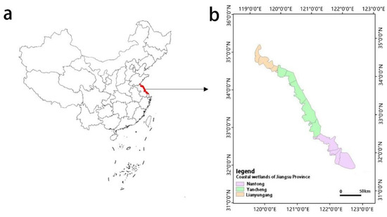 Study area. (a) The coastal wetlands of Jiangsu Province in China. (b) The coastal wetlands in Lianyungang, Yancheng, and Nantong.