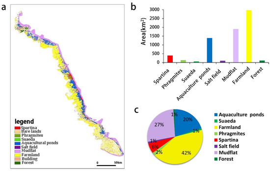 Classification of coastal wetlands ecosystems in Jiangsu Province in 2018. (a) Distribution of land types in coastal wetlands of Jiangsu Province. (b) Areas of different land types in coastal wetlands of Jiangsu Province. (c) Area proportions of different land types in coastal wetlands of Jiangsu Province.