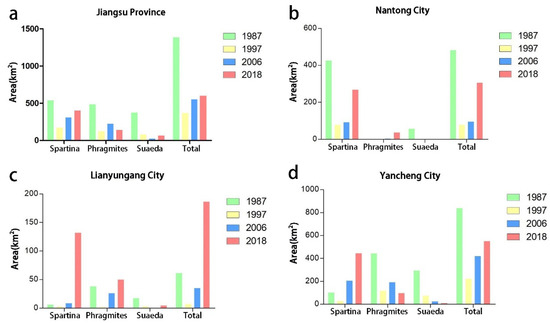 The total area of natural vegetation in the coastal region of Jiangsu Province (Figure 3a) showed a decrease from 1382 km2 in 1987 to 365 km2 in 1997, and then increased from 365 km2 in 1987 to 595 km2 in 2018. Although the area of natural vegetation recovered in 2018, it only occupied 43% of the total area in 1987. This indicates that the human utilization of CWs significantly affected the natural distribution of coastal vegetation in Jiangsu Province in the past. The changes of the area of the three natural salt marshes, of Spartina, Phragmites and Suaeda, show that although the Spartina salt marshes decreased significantly in size from 1987 to 1997, it showed a yearly increase from 1997 to 2018; the area of Phragmites salt marshes significantly reduced from 1987 to 1997, and then remained stable from 1997 to 2018; and the area of Suaeda salt marshes varied from 368 km2 in 1987 to 61 km2 in 2018, showing a yearly decreasing trend. These changes in the area of natural vegetation indicate that the reproductive and expansive capacity of the exotic species of Spartina alterniflora was very strong, whereas the adaptive survival capacity of the indigenous plant Suaeda salsa was weakened.