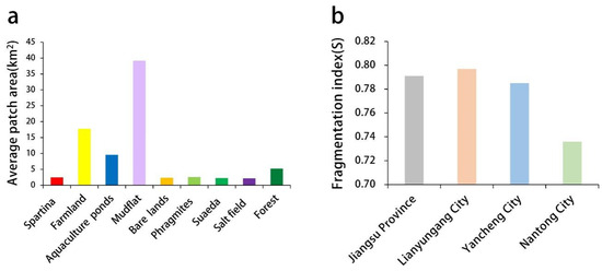 Based on the analysis of land use types in 2018 (Figure 4a), the largest average patch area in the coastal region of Jiangsu Province was occupied by mudflats, followed by farmland and aquaculture ponds, while the average patch areas of natural vegetation featuring Phragmites, Suaeda, and Spartina were similar and smaller. This indicates that land use by humans results in smaller natural vegetation patches and larger artificial patches.