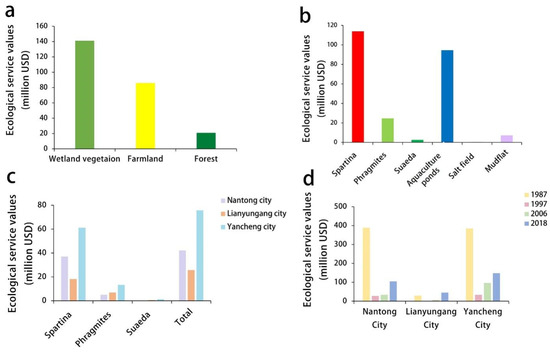 Based on the coefficients of ESV per unit area of different land types (Table 1) and the areas of distribution of different land types in Jiangsu Province (Figure 2b), the total ESV of wetland vegetation (including the plants Spartina, Phragmites, and Suaeda) in the coastal region of Jiangsu Province in 2018 was calculated to be USD 14.10 million, the ESV of farmland was USD 8.58 million, and the total forest ESV was USD 2.09 million (Figure 5a), placing it in the top three of all land use types. Although the area of farmland accounted for 42% of the total area of the coastal zone, its ecological value represented only 60% of the ecological value generated by the wetland vegetation that occupied 9% of the total area, indicating that agricultural development in the coastal zone seriously affected the ESV of the CWs. The ESVs can be ranked in descending order as wetland vegetation, farmland, and forest. Hence, the protection and restoration of forest and wetland vegetation should be strengthened in aspiring towards ecological protection in the coastal zone.