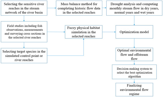 An overview of the proposed framework is essential. Figure 1 displays the flowchart of the framework in which some main parts are recognizable. First, sensitive river reaches are recognized in the stream network of the basin. The sensitive river reaches were defined based on two ecological considerations. First, they should be allocated downstream of the main rivers in the catchment, which means that if we can supply enough ecological flow in these reaches, upstream habitats of the rivers will be protected as well. Second, the initial study indicated that these reaches are highly vulnerable aquatic habitats in the study area.