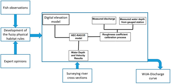 Figure 2 displays the workflow of the fuzzy hydraulic habitat simulation in this study. Expert opinions are applicable to develop fuzzy approach requirements. This study applied a combination of expert opinions and field observations to develop verbal fuzzy rules for selected target species. HEC-RAS 1D was used to simulate depth and velocity in the cross section of the selected reaches in the basin. Then, fuzzy rules were combined with velocity and depth distribution to develop the ecological impact function of habitat suitability. More details of the habitat simulation have been highlighted in the previous research works, as cited in the introduction.
