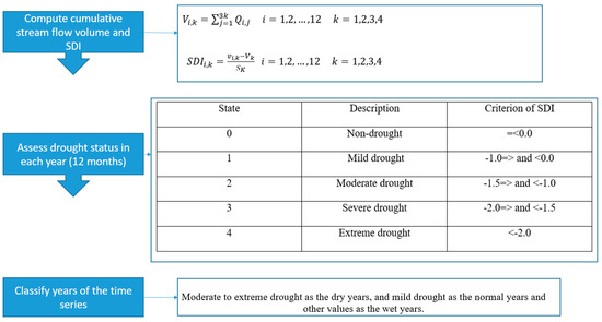 Flowchart of drought analysis. K means the period of drought analysis (three to twelve months) and V and S are mean and standard deviation of cumulative stream flow volume, respectively [31].