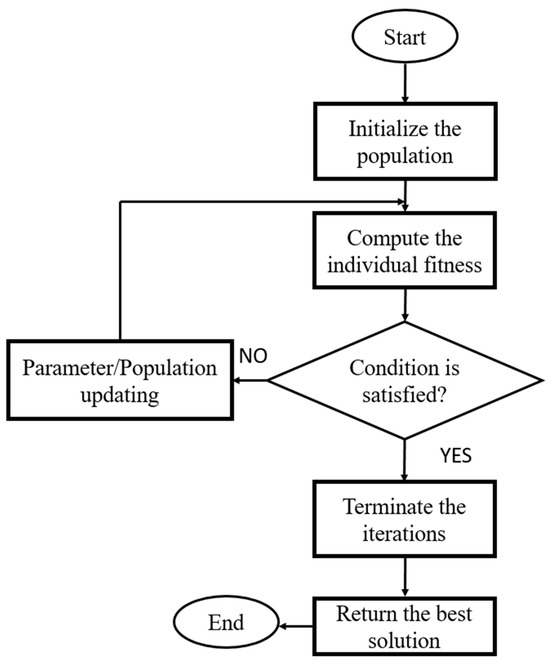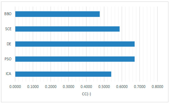This research work applied different evolutionary algorithms in the optimization process. The general steps of these algorithms are the same as displayed in Figure 4. However, they might use different strategies for finding the best solution. Five algorithms were utilized including the imperial competitive algorithm (ICA) [32], particle swarm optimization (PSO), differential evolution algorithm (DE) [33], shuffled complex evolution algorithm (SCE) [34] and biogeography-based optimization (BBO) [35].