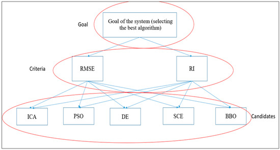 Utilizing different evolutionary algorithms in the optimization process is essential. In fact, these algorithms might not be able to guarantee the global optimization. Thus, selecting the best optimal solution using the different algorithms might be a challenge in the proposed method. This study utilized the fuzzy technique of order preference similarity to the ideal solution (FTOPSIS) as a robust decision-making system to finalize the optimal ecological flow in the proposed framework. Figure 5 displays a flowchart of this method. Generally, a hierarchical structure is required to apply this method including goals, criteria and alternatives. Figure 6 displays the developed hierarchical structure for this study.