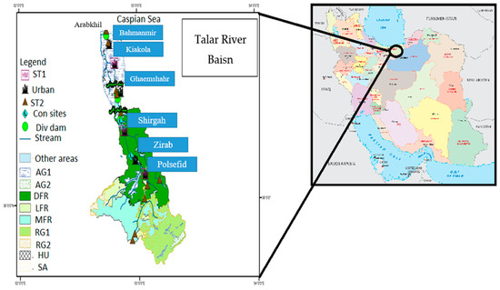 The Talar River is one of the most important rivers in the Mazandaran Province, Iran, which was selected as the case study in this study. The main economic activity for the people in this river basin is agriculture. Hence, this river plays a key role in supplying irrigation demand in the basin. Moreover, the stream network of this basin is highly valuable in terms of ecological status. In fact, several native fish species utilize these habitats for reproduction and other biological activities such as searching for food. Due to considerable irrigation demand for the farms, there is a significant challenge in the ecological management of the river basin. On the one hand, farmers and the regional agricultural authority request maximum offstream flow, meaning instream flow might be reduced drastically. On the other hand, the Department of Environment tries to protect valuable river habitats by confining pumping in the river. Hence, negotiations between stakeholders and ecological managers are escalated in this regard. An assessment framework of the optimal ecological flow is required to mitigate water supply loss and ecological impacts at the river basin scale. In fact, farms are scattered in the basin and many pumping stations and diversion structures are installed to supply irrigation demand. Thus, it is necessary to use an advanced framework at the river basin scale to balance ecological impacts and water supply loss. Figure 7 displays the location of the Talar Basin, stream network and land use map.