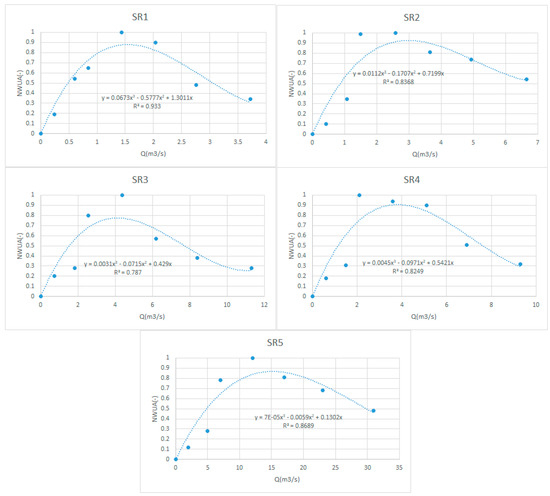 Figure 9 displays the normalized weighted useable area (NWUA) functions as the main output of the hydraulic habitat simulation in the selected river reaches. The NWUA indicates the ideal ecological flow regime in the river. The regression model to develop final functions was used in the optimization system. The L3 regression model was the best correlated model for all the simulated reaches. The biological response of river habitats to the change in discharge in the rivers is not linear and demonstrates the necessity of using ecological-based methods to assess ecological flow. In other words, some methods such as hydrologic desktop methods consider a linear relationship between an increasing rate of flow and biological response in the habitats. In fact, these methods recommend that increasing ecological flow is appropriate in all hydrologic conditions. However, the developed NWUA functions in this study corroborate that hydrologic desktop methods are not reliable for assessing ecological flow.