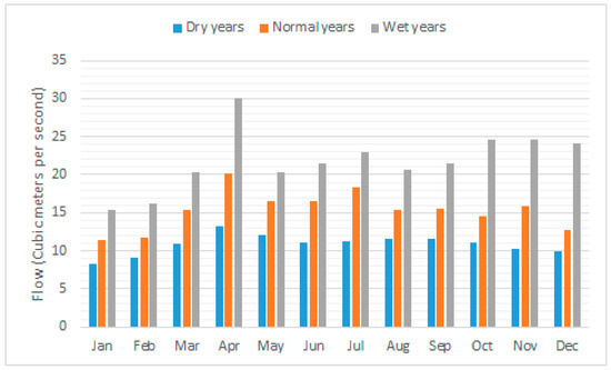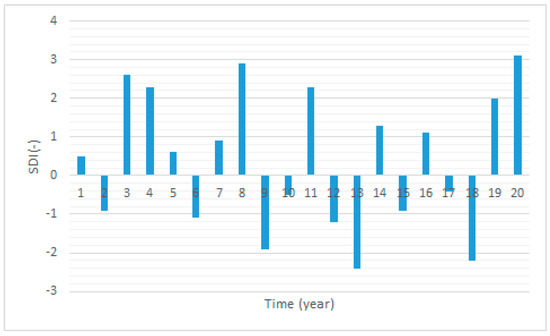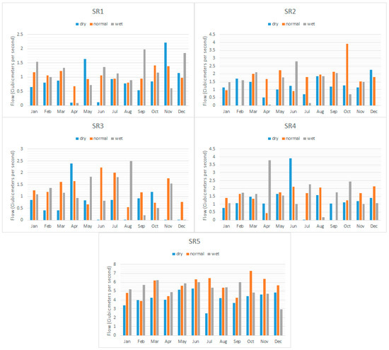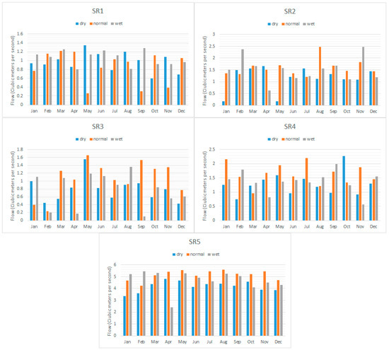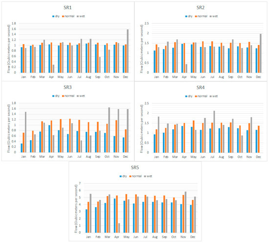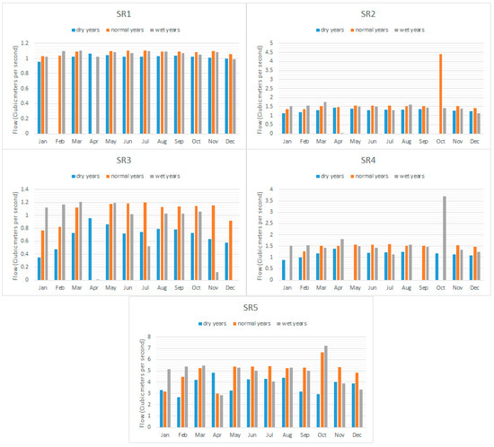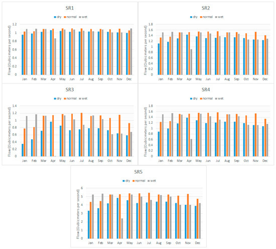 Another required input for the optimization model is the monthly flow time series of different hydrological conditions. Based on the stream drought index, Figure 10 displays a computed index in the long-term period that was used to calculate the average monthly time series in different hydrological condition including drought as well as normal. This study applied a long-term period in the past years in which instream flow was approximately the same as the natural flow. Thus, the outputs of the hydrological analysis might be reliable and robust for further applications. As presented, the mass balance method was utilized to generate flow time series in the selected reaches where hydrometric stations were not available. Figure 11 shows the flow time series at SR5 as a sample of the results of the hydrological analysis.