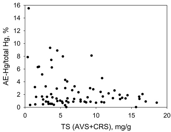 Ravichandran et al. [27] reported that Hg sulfide formation could also be interfered with using dissolved organic matter (DOM) to some extent. Could the highly scattered pattern of the AE Hg vs. TS plot (Figure 2) be the result of the interference of DOM on Hg sulfide formation in the sediments? This speculation will be discussed in a separate paper.