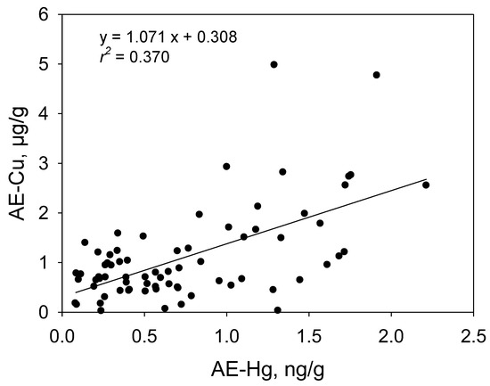 For comparison, the Zn concentration in the sediments ranged from 9.0 µg/g to 198.5 µg/g (average 102.7 ± 67.3 µg/g, n = 41). The AE-Zn was, on average, 77.7 ± 24.9 µg/g, or 75.7% of the total Zn, a much higher percentage than those of the AE-Hg or the AE-Cu (2.1% or 15.4%, respectively, of the total), but within the range of other studies [8,9].