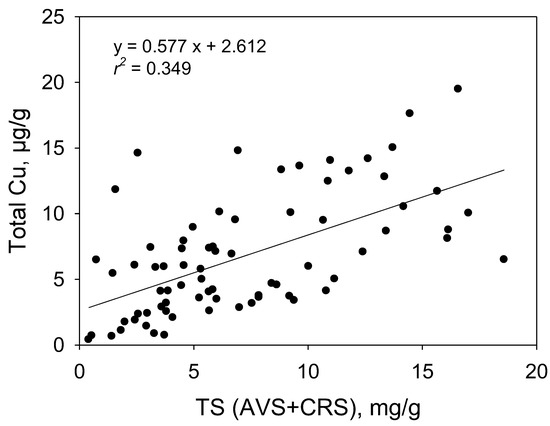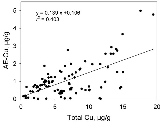 Total copper in the sediments was weakly correlated with the TS (r2 = 0.349, Figure 3). Apparently, the degree of Cu sequestration via sulfide is not as complete as that of Hg. As such, weak correlations existed between total Cu and total sulfide. AE-Cu was also weakly correlated with total Cu (r2 = 0.403, Figure 4).