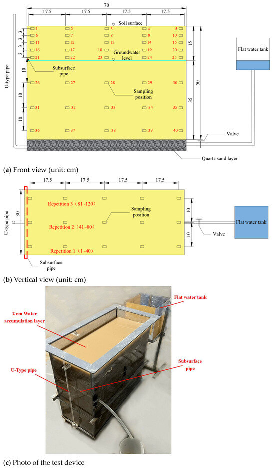 (5) Soil sampling: after the water in the surface layer of the soil completely subsided, the soil was left undisturbed for 48 h, and soil samples were collected using a soil drill with a diameter of 4 cm. As shown in Figure 1a,b, soil samples were taken at 5, 15, and 25 cm from the front of the soil tank for three replicates, with 40 soil samples taken each time.