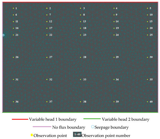 The simulation area includes the soil section of the soil tank, which measures 70 cm in length and 50 cm in height. The location and number of 40 soil observation points are consistent with the sampling points shown in Figure 1a (Figure 2). The soil bulk density and initial water content of each layer were set to 1.4 g/kg and 25%, respectively. The initial salt content of the soil was set to 1.7 g/kg and 2.5 g/kg, according to Table 1.