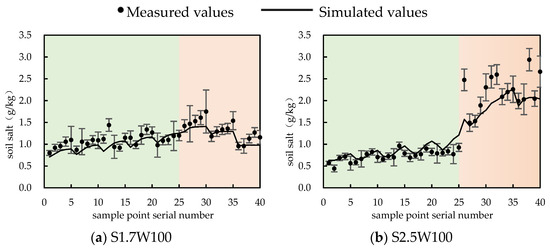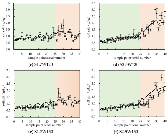 The simulated soil salt content at 40 observation points in the HYDRUS-2D model under different treatments was close to the measured value in the soil tank test (Figure 3). The nRMSE of the soil salt content above the subsurface pipe (sample numbers 1–25 in Figure 2) was 13–21%, which was higher than the nRMSE of the soil salt content below the subsurface pipe (sample numbers 26–40 in Figure 2), but the nRMSE of the soil salt content of all samples (sample numbers 1–40 in Figure 2) was 15–24% (Table 4). The simulation was good.