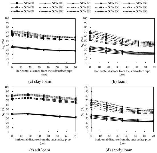 Spatial variation in the soil desalination rate affects the distribution of soil salinity after winter irrigation. In the horizontal direction, the average desalination rate Nh of the 0–15 cm soil layer decreased as the distance from the subsurface pipe increased, but the decrease was relatively small, suggesting that the leaching effect of winter irrigation in farmland was not significantly affected by the horizontal distance from the subsurface pipe. The decrease in Nh was influenced by soil texture. Under loam conditions, the decrease in Nh was most significant, and the desalination rate at the farthest point from the subsurface pipe was 18.1% lower than that above the subsurface pipe. For sandy loam and clay loam, Nh decreased by an average of 11.2% to 16.3%. For silty loam, the decrease in Nh was the lowest, with an average of only 7.5% (Figure 5). In addition, the decrease in Nh with increasing distance from the subsurface pipe was greater when there was a higher initial soil salt content and a larger irrigation quota. When the irrigation quota was kept constant, the Nh with an initial salt content of 1, 3, and 5 g/kg decreased by an average of 10.2%, 13.9%, and 14.7%, respectively, at the farthest point from the subsurface pipe. When the initial salt content of the soil was the same, the Nh corresponding to the irrigation quotas of 80–180 mm decreased by 9.5% to 15.4%.