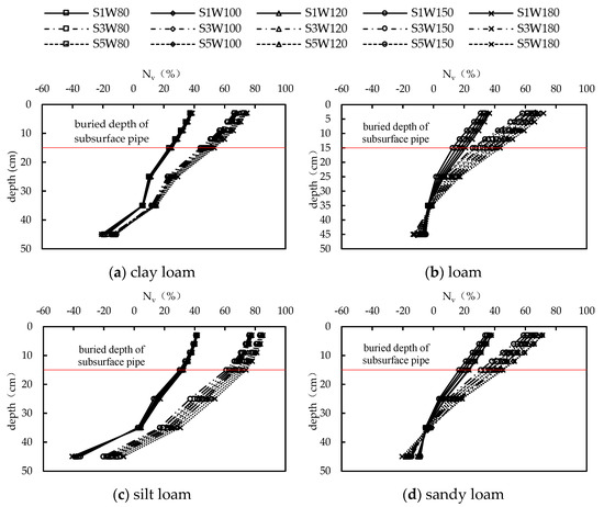 In the vertical direction, the average desalination rate Nv decreased with increasing soil depth in the 0–70 cm horizontal distance (Figure 6). Among the soils, the loam soil Nv value decreased the most, with an average decrease of 26.4% around the subsurface pipe compared to the surface soil. The second type of soil was sandy loam and clay loam, and the average decrease in Nv was 18.7–22.8%. The Nv of the silt loam soil decreased the least, with an average of 12.1%. When the irrigation quota was kept constant, the average decrease in Nv with initial salt contents of 1, 3, and 5 g/kg was 14.3%, 21.7%, and 24.1%, respectively. When the initial salt content of the soil was the same, Nv decreased by 17.5% to 22.3% when the irrigation quota was 80–180 mm. At a depth of 0–10 cm below the surface, the Nv of the four soil textures ranged from 12.1% to 73.8%. When the depth increased to 20 cm below the subsurface pipe, the Nv became negative, indicating salt accumulation.