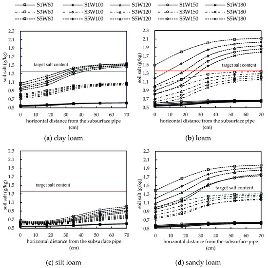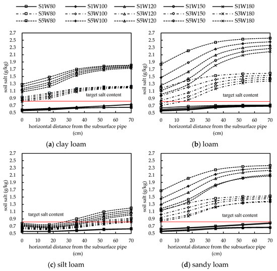 In this study, it was found that the depth of the soil layer where salt accumulation occurred with subsurface pipes in silty loam and clay loam was deeper than that of loam and sandy loam, a phenomenon which is consistent with the results of Wang and Tian, who found that groundwater evaporation is related to the size of pores between soil particles. The size of pores between loam and sandy loam is large, the capillary action is strong, the water rising speed is fast, the rate of groundwater evaporation is high, and the soil salt release is strong. While the size of pores between silty loam and clay loam is small, exceeding the capillary range, capillary action is not strong, and the soil does not easily release salt [58,59].