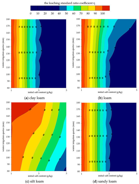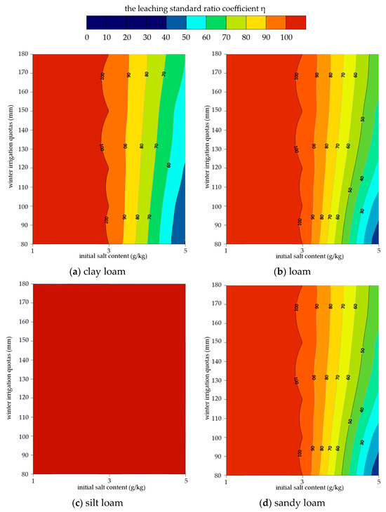 For corn, when the initial soil salt content was ≤1 g/kg and the winter irrigation quota was ≥80 mm, the soil salt content with the use of a subsurface pipe was less than 0.7 g/kg in all four soil types. When the initial soil salt content was ≥3 g/kg and the winter irrigation quota was ≤180 mm, the soil salt content within the control range of the subsurface pipe could not be less than 0.7 g/kg in clay loam, loam, and sandy loam. However, in the case of silt loam, the range of η varied from 39.2% to 100% (Figure 10).